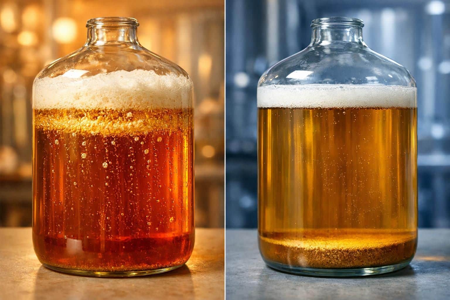 La différence centrale réside dans le type de levure et la plage de température. La fermentation haute utilise des levures actives à des températures plus élevées, produisant davantage d’esters aromatiques et une carbonatation plus élevée, tandis que la fermentation basse opère à des températures plus froides et donne une bière plus nette et moins arômatique.